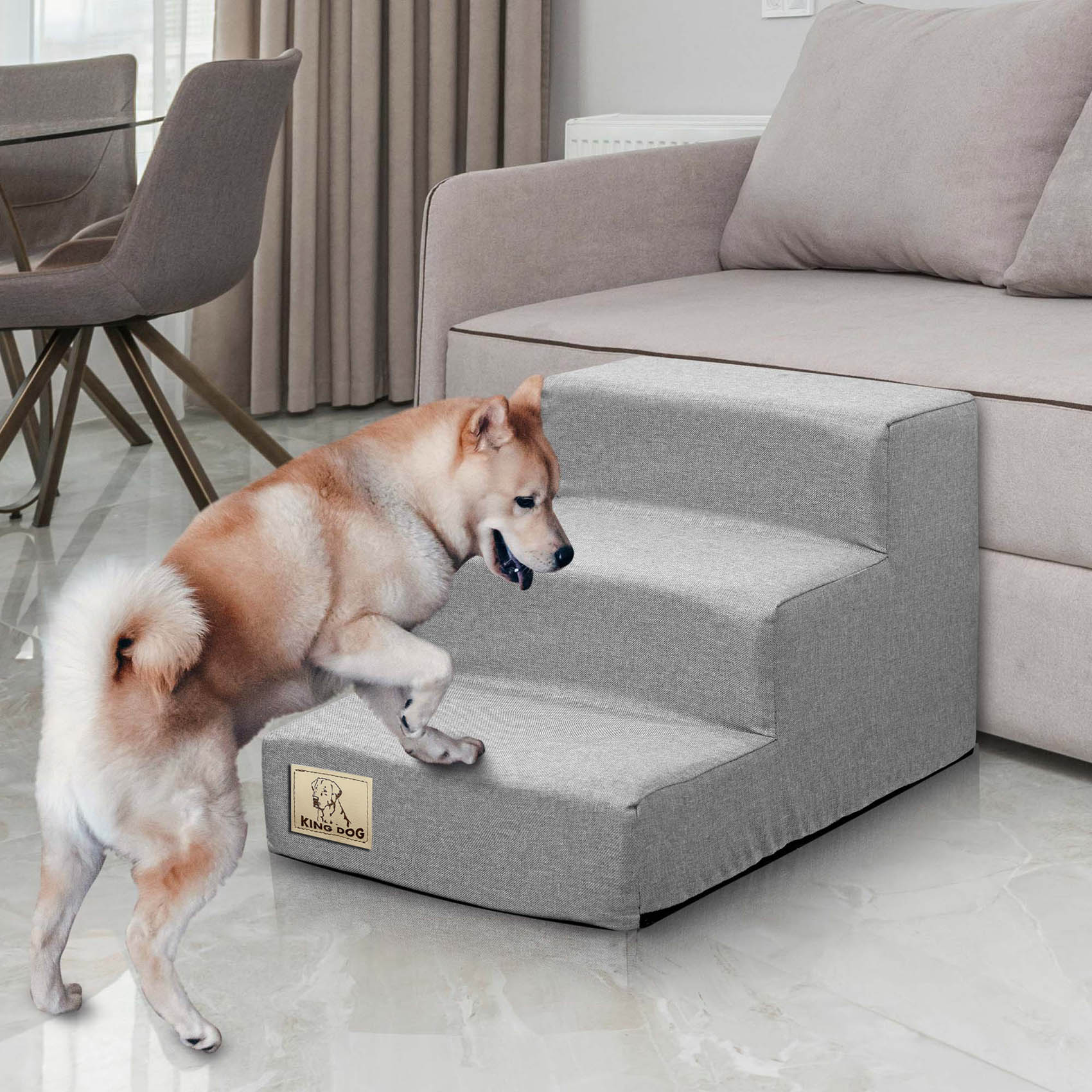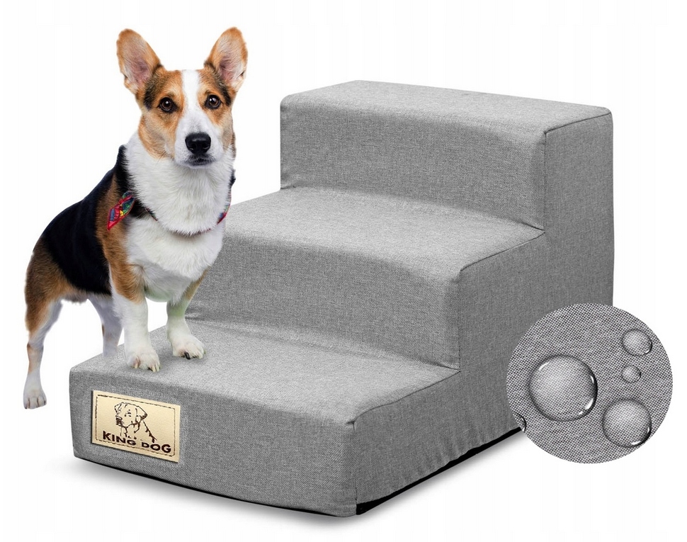Schodki dla psa wodoodporne w kolorze szarym, wyprodukowane z myślą o małych rasach psów oraz kotów.