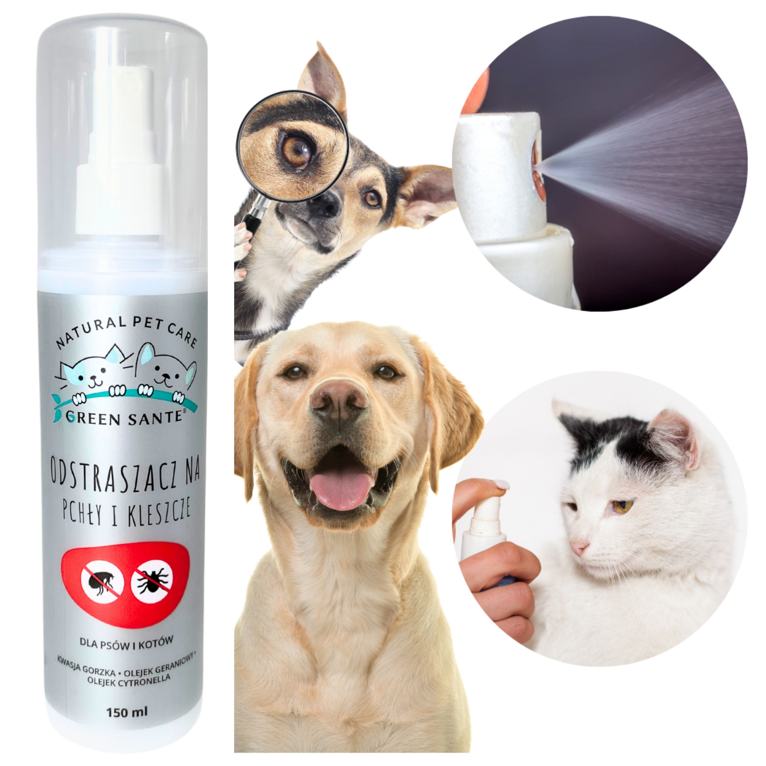 - Odstraszacz GREEN SANTE® zawiera ocet jabłkowy, który jest cenionym środkiem odstraszającym kleszcze, pchły, roztocza i komary. Ocet jabłkowy ma też kojący wpływ na przesuszoną skórę oraz kondycjonuje sierść zwierzęcia.