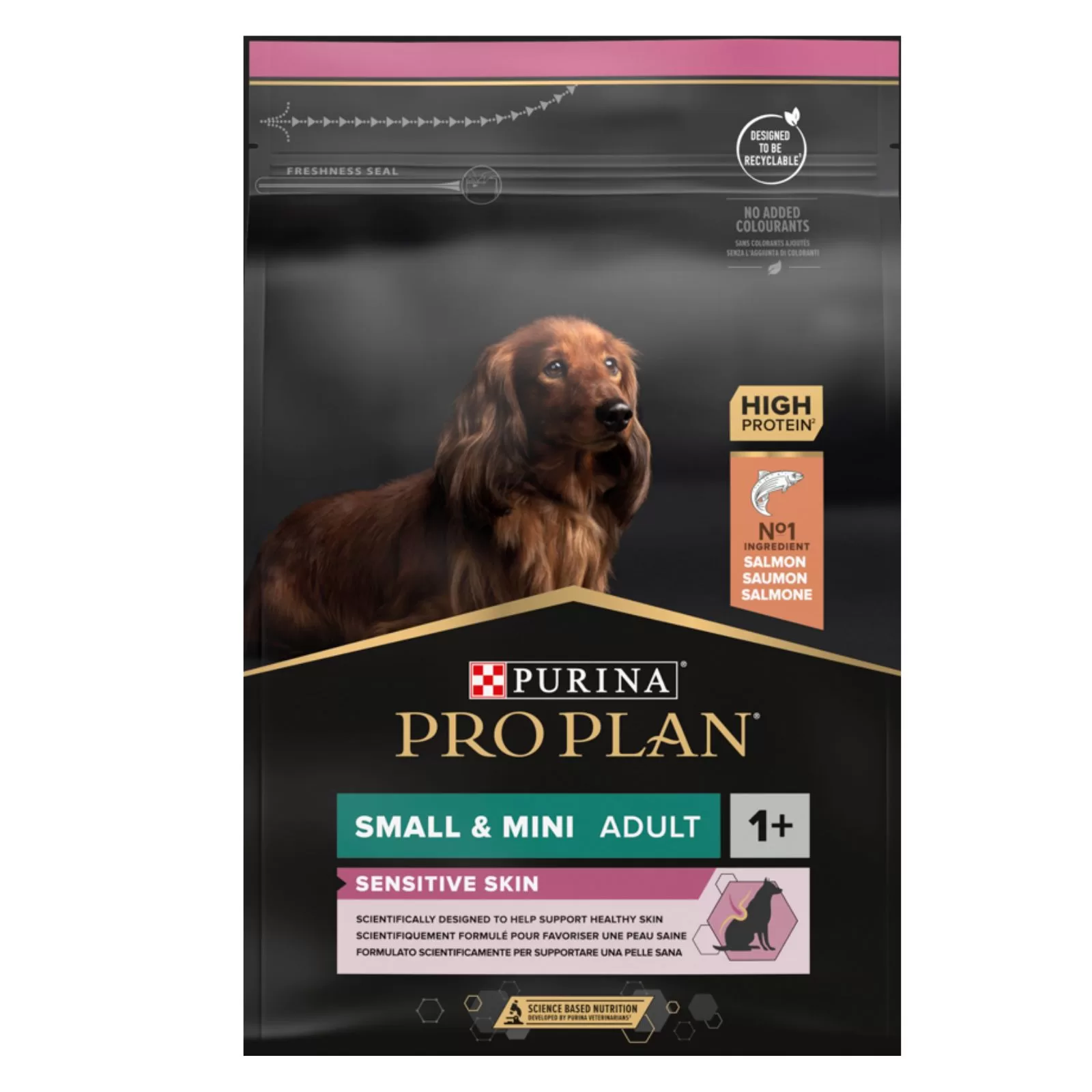 PURINA PRO PLAN Small & Mini Adult Sensitive Skin z formułą OPTIDERMA to pełnoporcjowa sucha karma dla psów o wrażliwej skórze.