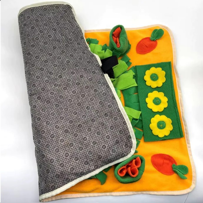 - W następnym kroku możesz ukryć smakołyki w całej macie pod kilkoma warstwami tkaniny. Twoje zwierzę na pewno wyczuje smakołyki przez tkaninę. Jeśli Twój zwierzak nie znajdzie ukrytych przysmaków po kilku próbach, pomóż mu je znaleźć.