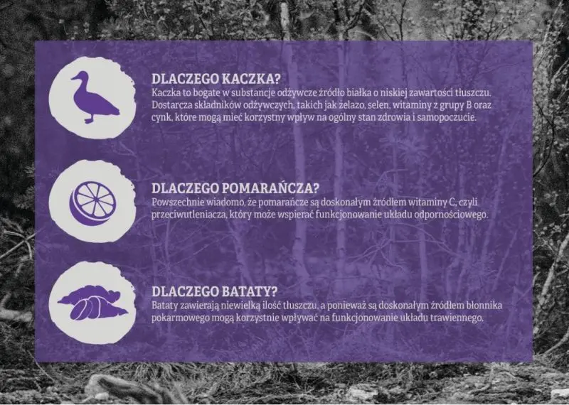 - Kaczka 52% (w tym świeżo przygotowana kaczka 26%, suszona kaczka 24%, bulion z kaczki 2%),