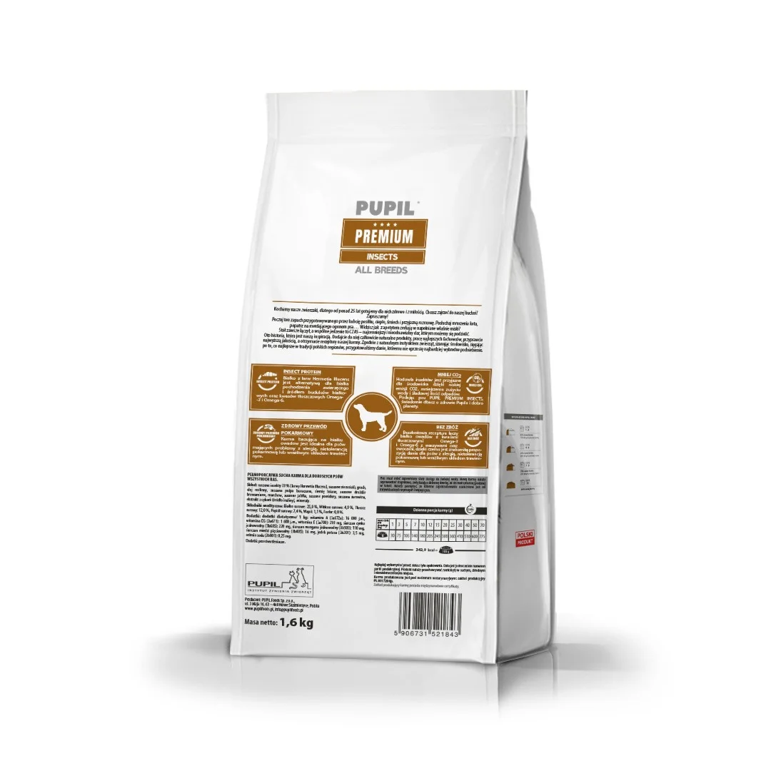- Na dobrze tolerowaną przez psy recepturę karmy PUPIL PREMIUM INSECTS, opracowaną przez naukowców z Pupil Instytutu Żywienia Zwierząt, składa się tylko kilka starannie wyselekcjonowanych składników dostarczających Twojemu psu niezbędnych witamin, minerałów i mikroelementów. Psy uwielbiają smak tej karmy i chętnie czekają na kolejną porcję aromatycznego posiłku.