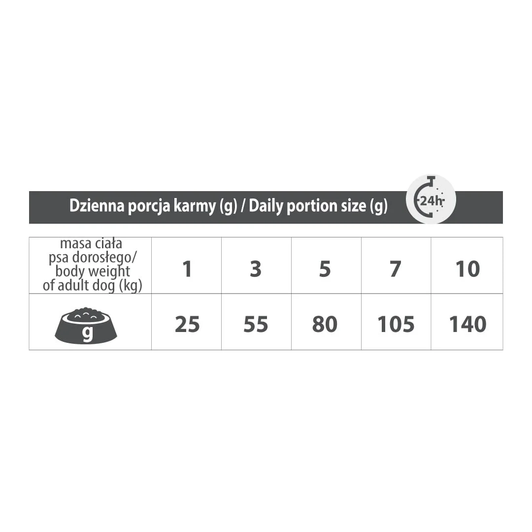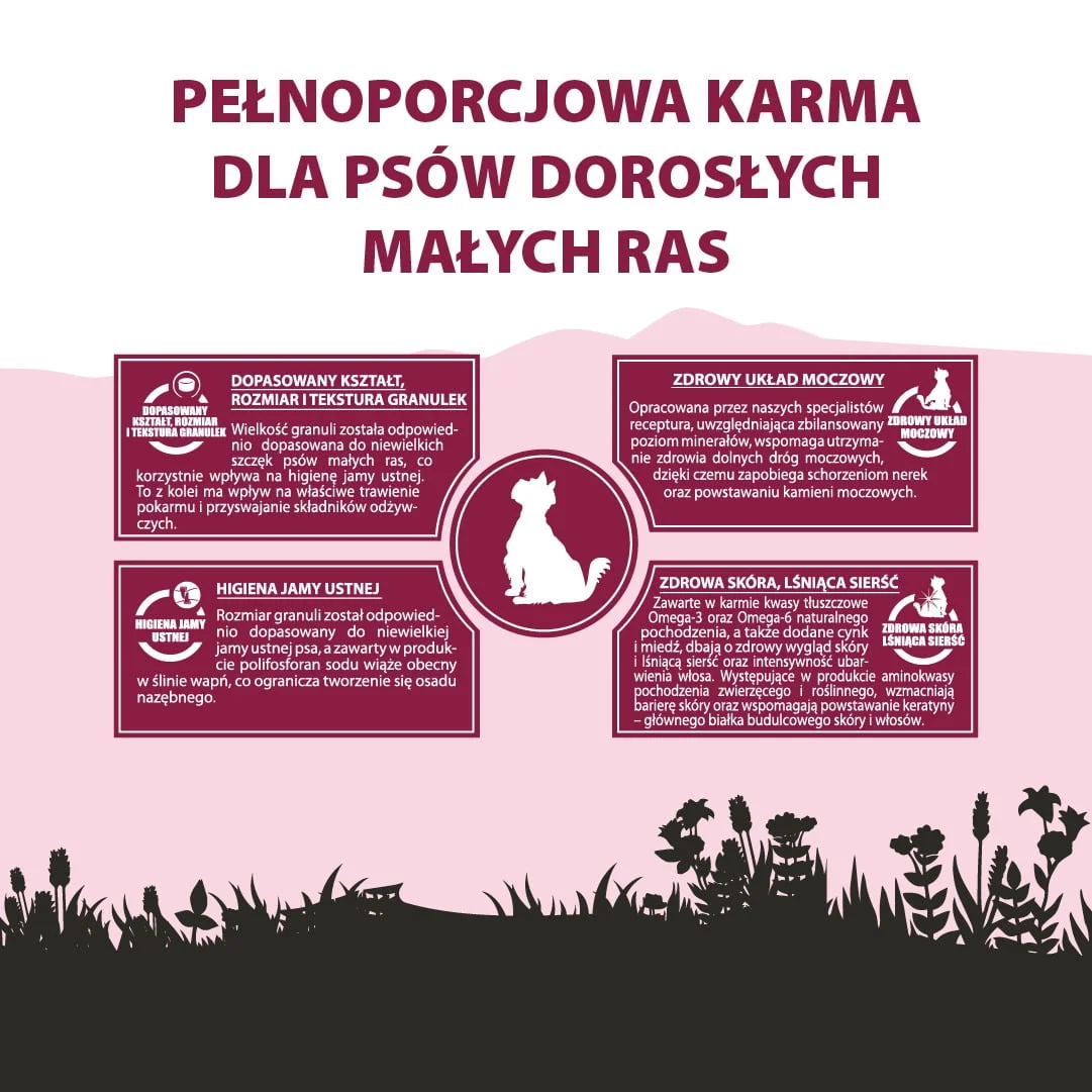 - Pełnoporcjowy posiłek w postaci suchej karmy dla psów dorosłych ras małych i miniaturowych