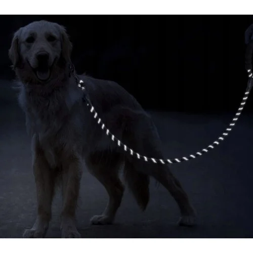 - Praktyczne elementy odblaskowe są na całej długości smyczy. Jest to dodatkowe zabezpieczenie dla psa i właściciela, zwiększające ich widoczność na drodze po zmroku.