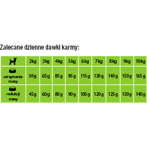 Składniki analityczne: białko 28%, tłuszcz 13%, popiół surowy 7,7% włókno surowe 3%, kolagen 13,5g/kg, glukozamina 0,31g/kg, chondroityna 0,2g/kg, MSM 0,1g/kg