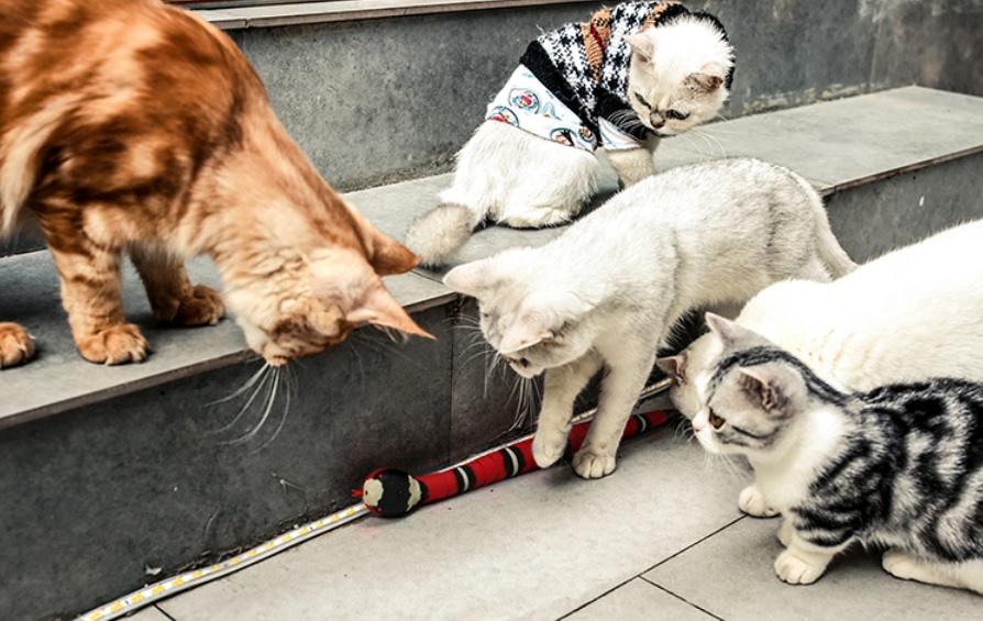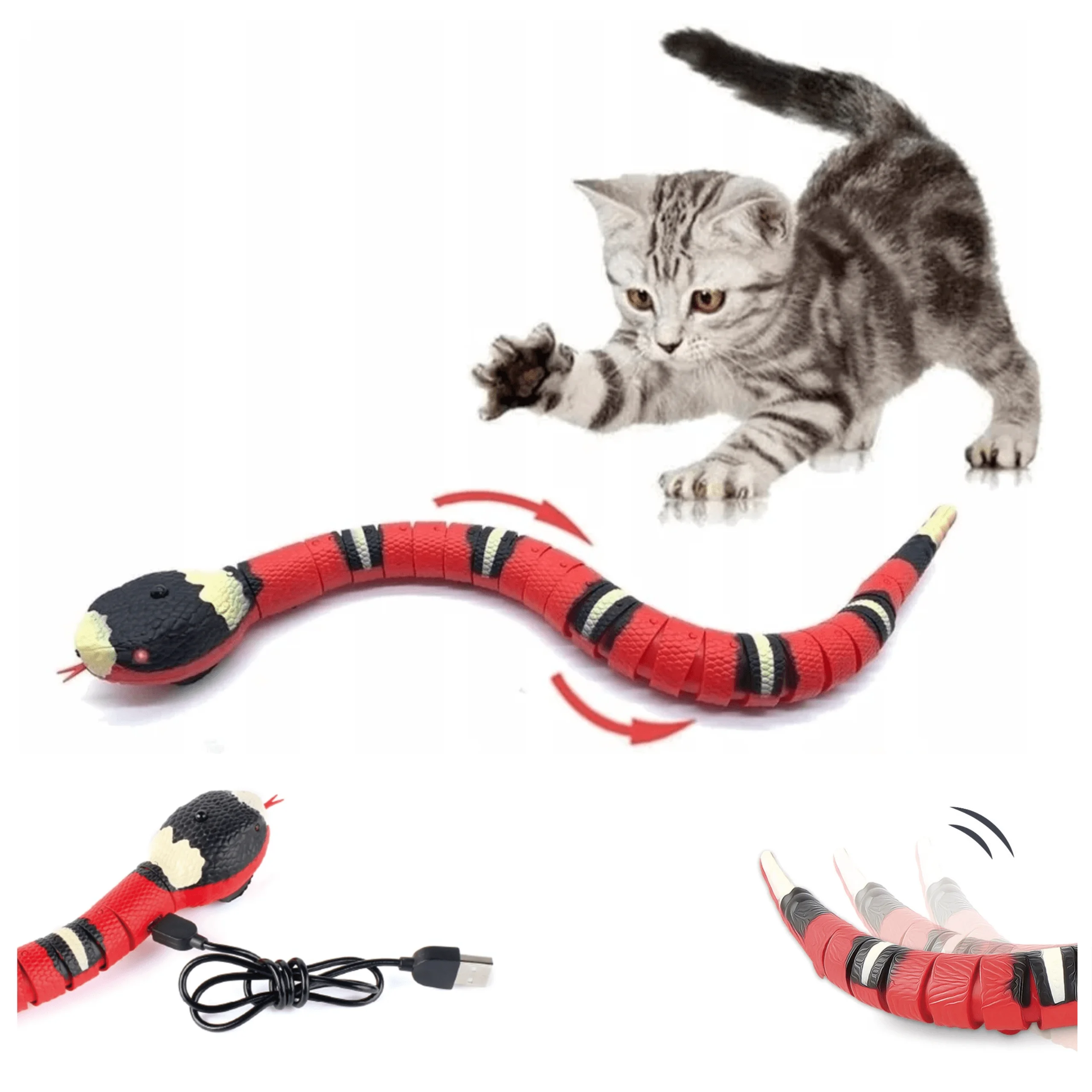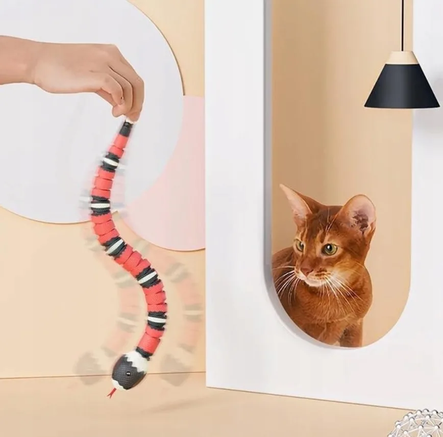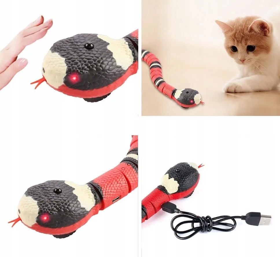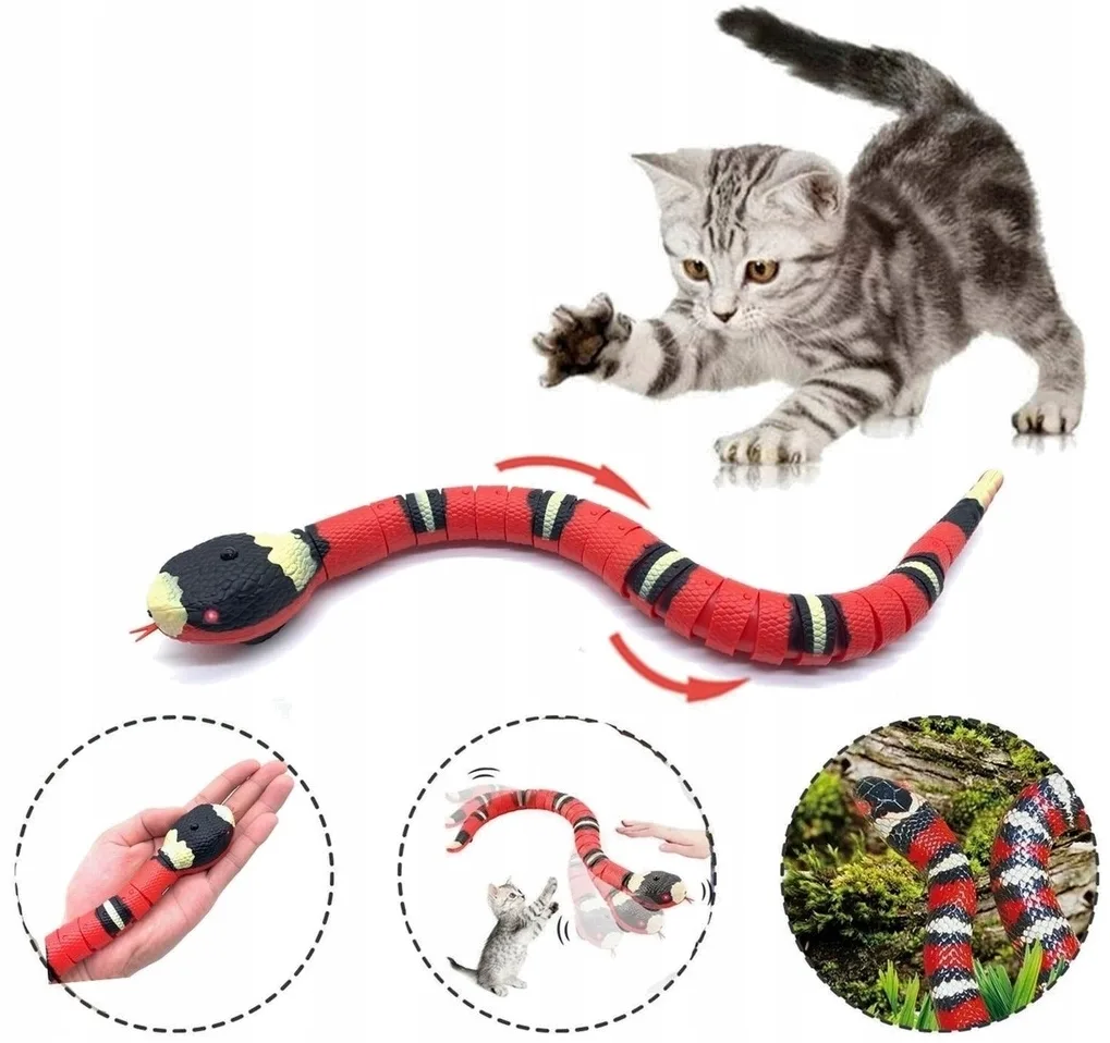 - realistyczne ruchy – dzięki wbudowanemu mechanizmowi wąż porusza się w sposób naśladujący prawdziwe ruchy węża. Wyposażony został w czujniki, które reagują na dotyk i ruch kota. Wbudowane diody LED powodują, że oczy węża świecą w ciemności, a różnorodne dźwięki przypominające syk węża dodatkowo przyciągają uwagę kota, zapewniając pełne wrażeń doświadczenie. Kot będzie nieustannie zainteresowany i zmotywowany do zabawy.