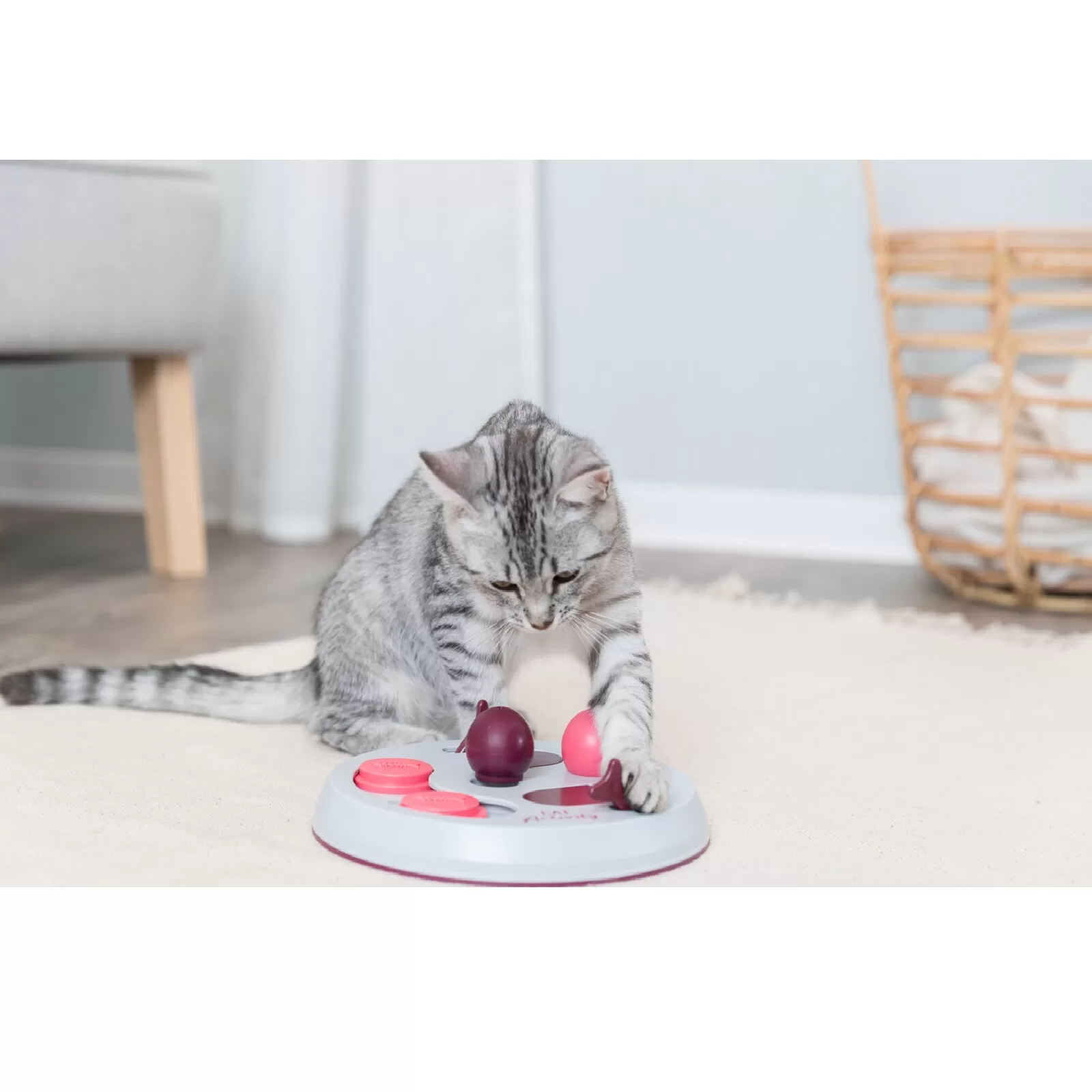 Spraw, aby przekąski były bardziej interesujące dla Twojego kota, umieszczając je w różnych kryjówkach naszej gry dla kotów. W kryjówkach można też umieścić suchą karmę. Twój kot może użyć łapek, pyska i odrobiny umiejętności, aby wyłowić smakołyki z zagłębień pod powierzchniami przesuwanymi, pokrywami na zawiasach i pod dwoma stożkami.