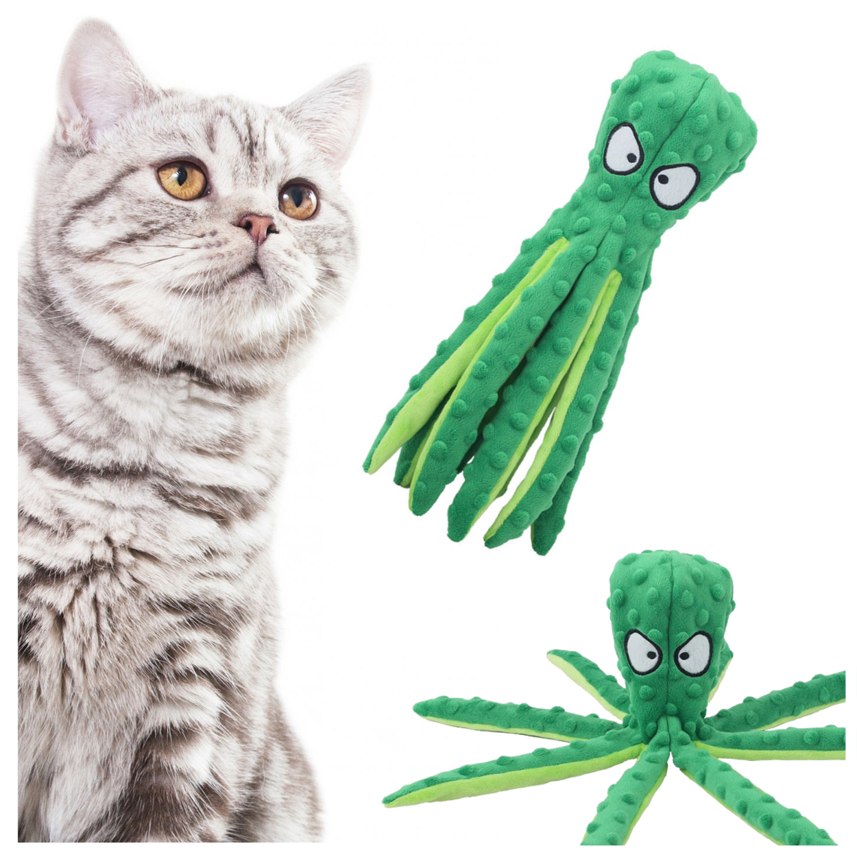 Zabawka została wyposażona w szeleszczące macki, które zachęcają zwierzaka do zabawy.